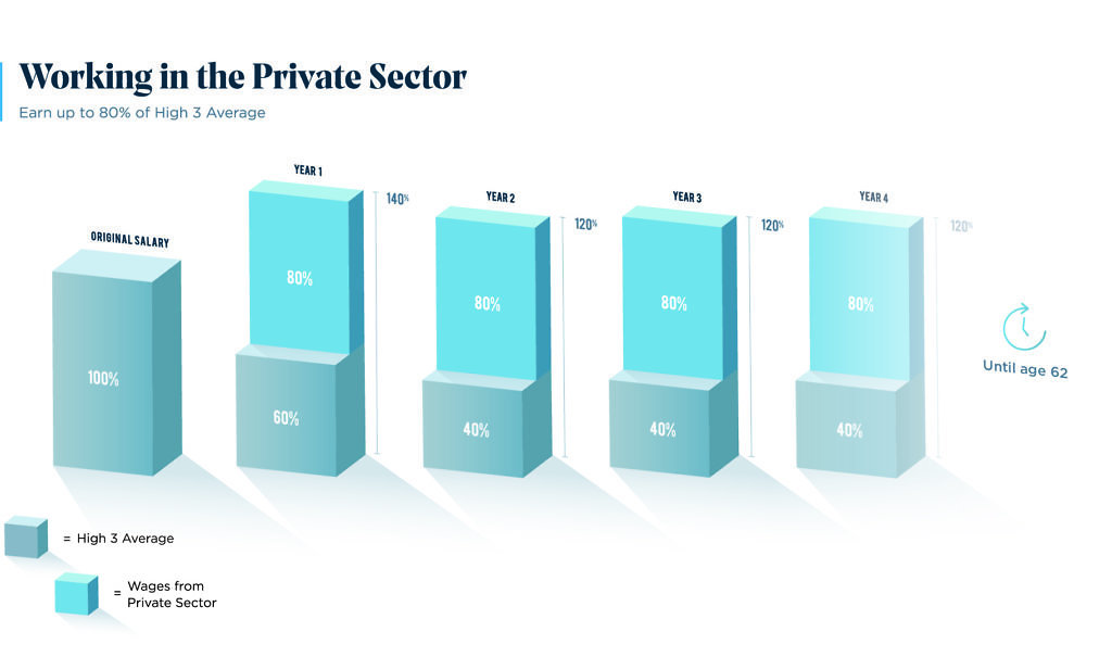 The graph below illustrates the income potential while receiving the disability retirement annuity and working in the private sector.