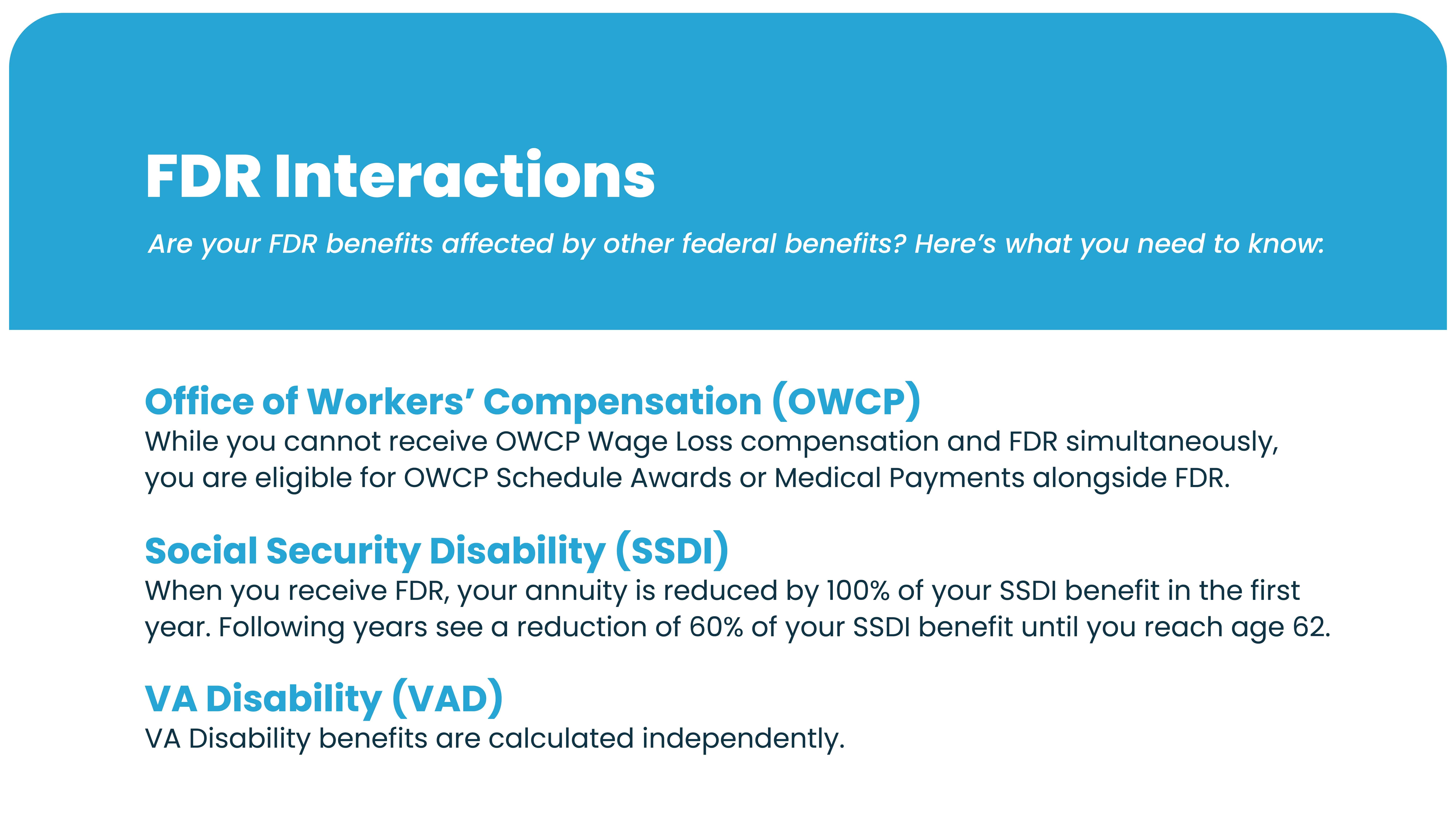 For Federal Disability Retirement, there is an interaction between Federal Disability Retirement and your Social Security Disability. In this case your FDR annuity is reduced by 100% of your SSDI benefit in the first year. Following that, the reduction drops to only 60% of your SSDI benefit until you reach age 62. After that first year you do get more money for having both benefits.
