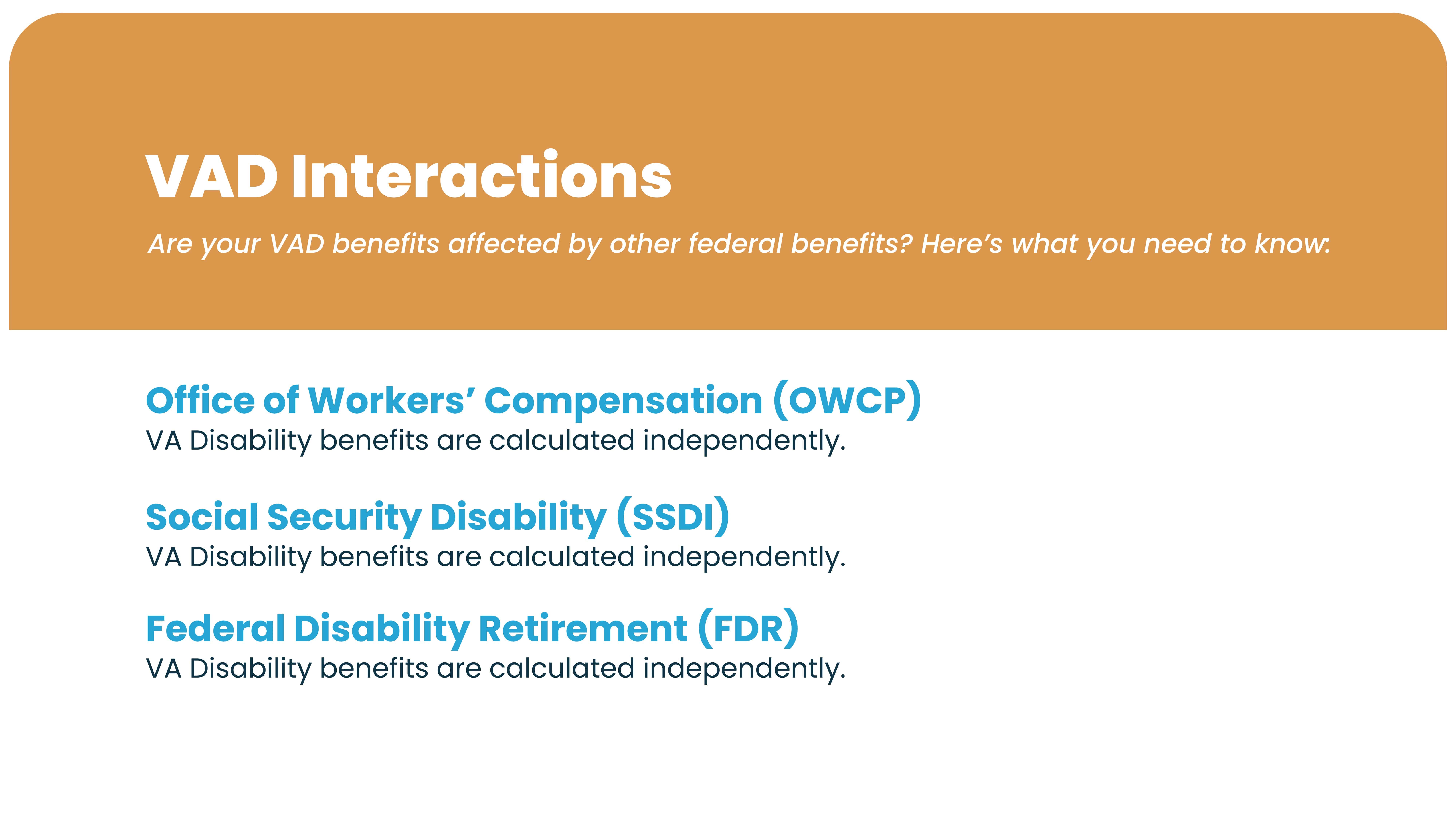 Caleb: This one across the board is the same answer. For OWCP, for SSDI, and for Federal Disability Retirement there is no offset reduction and VA disability benefits are calculated independently. If you’re interested in receiving any other type of disability besides VA disability, keep in mind that there is no reduction, penalty, or offset. You can receive both benefits – really you can receive them in full and the VA disability will not change.