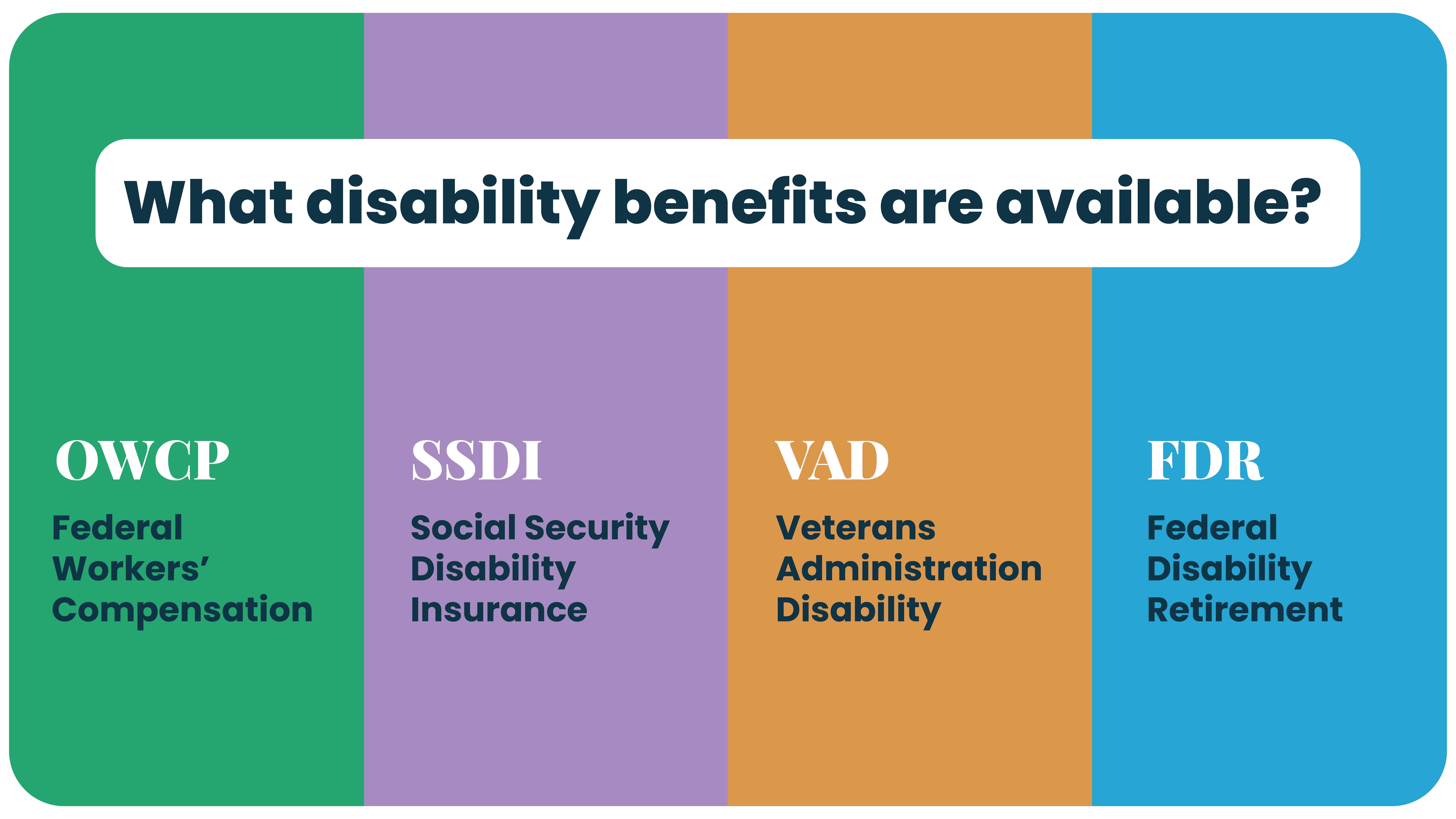 Michelle: There are four main disability benefits we’ll discuss: OWCP (workers’ compensation), SSDI (Social Security Disability Insurance), VA disability, and FDR (Federal Disability Retirement).