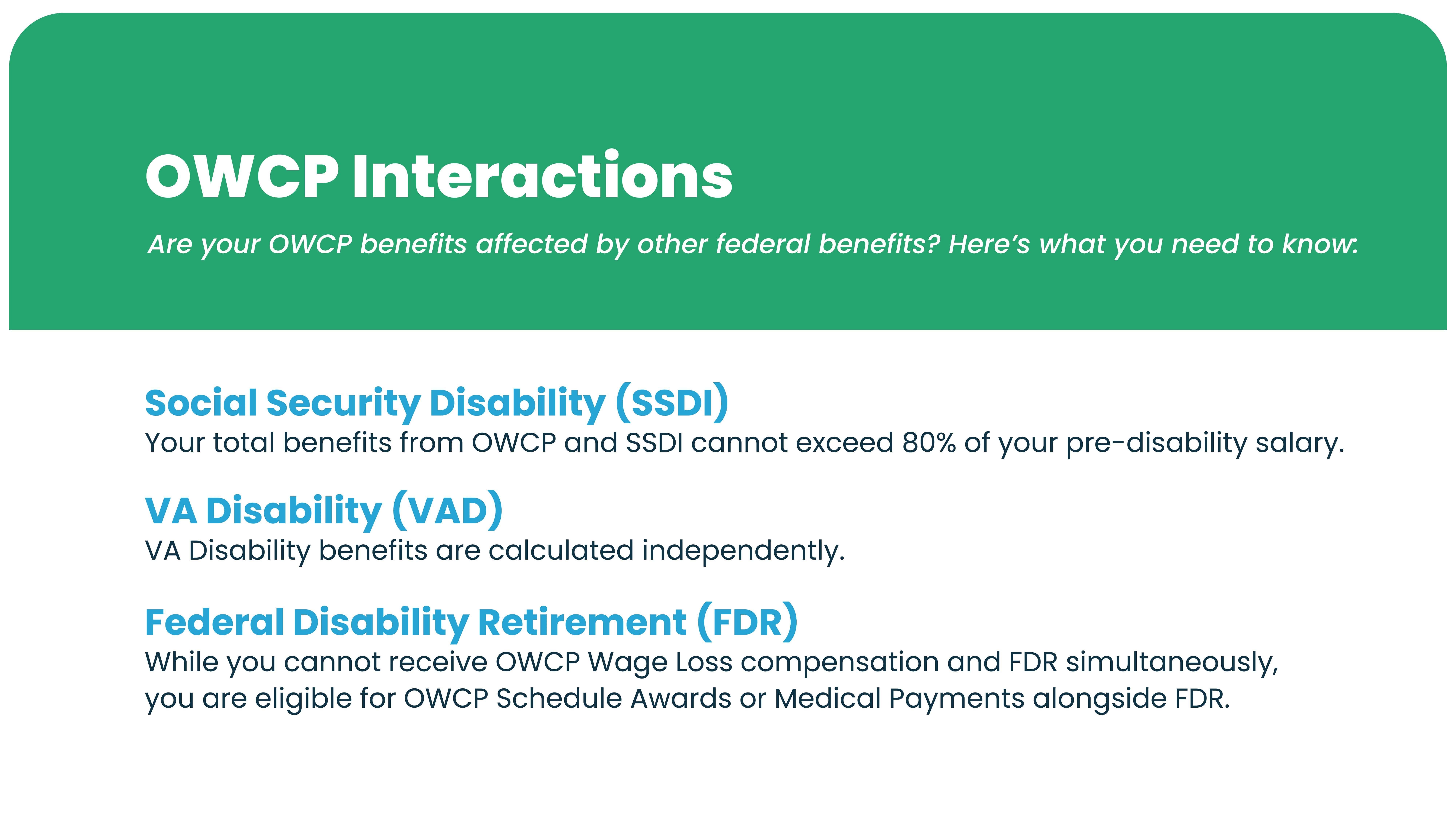 Your total benefits from OWCP and SSDI cannot exceed 80% of your pre-disability salary. There’s a hard cap with both benefits combined that cannot exceed 80% of what your salary would have been prior to your disability.
