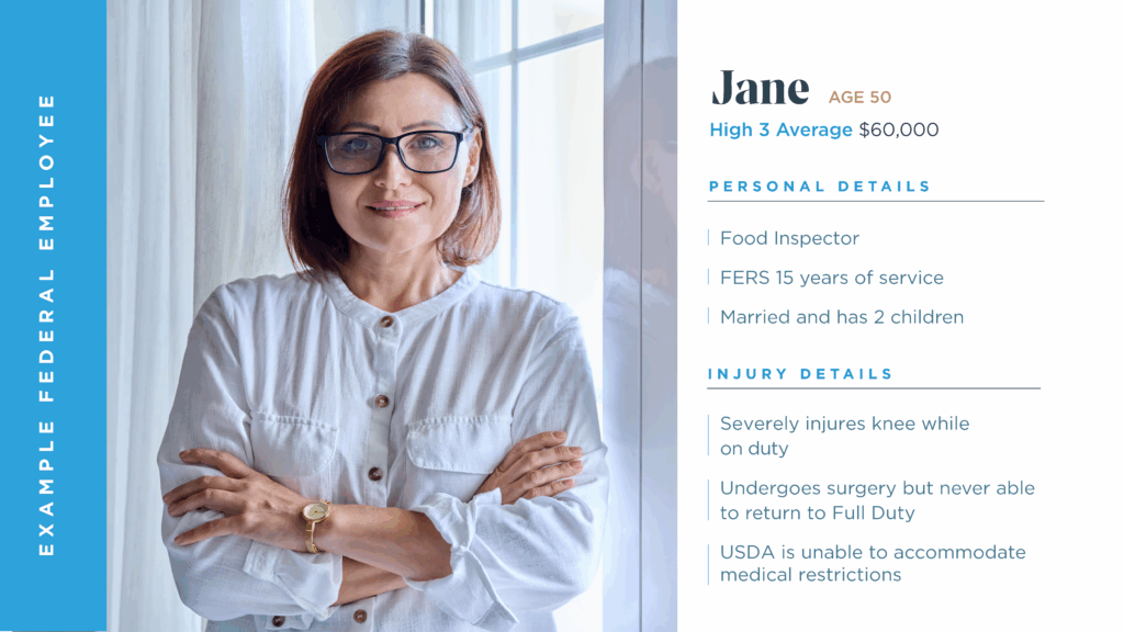 Let’s take a look at Jane’s injuries. She severely injured her knee while on duty—which is different than what happened to Jim, who was injured off duty. She underwent surgery but was never able to return to full duty, and the USDA was unable to accommodate her medical restrictions.