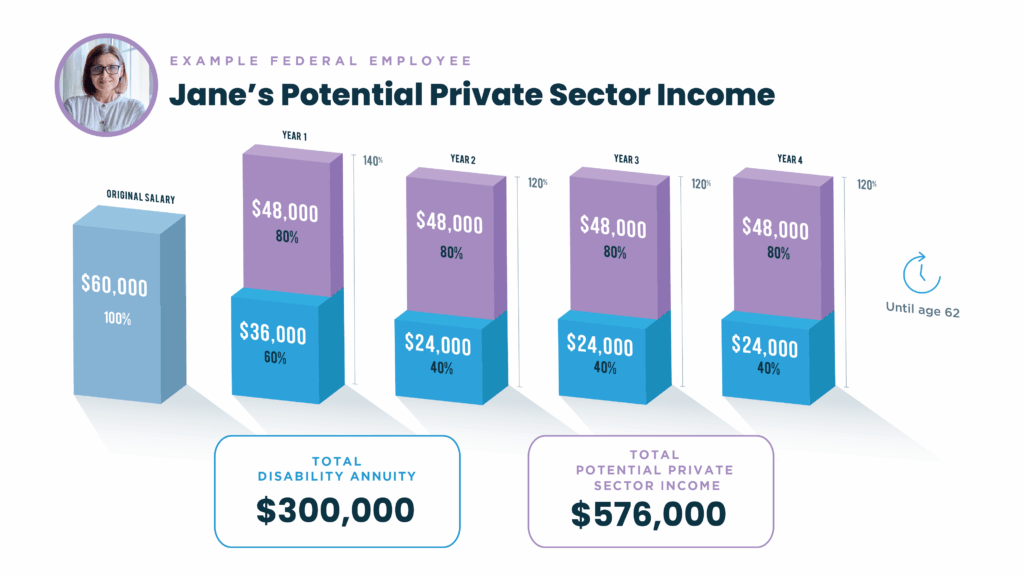 - The financial benefit is substantial: In year one, you receive 60% of your high-three salary; after that, 40% until age 62—plus you can earn private sector income on top of that.