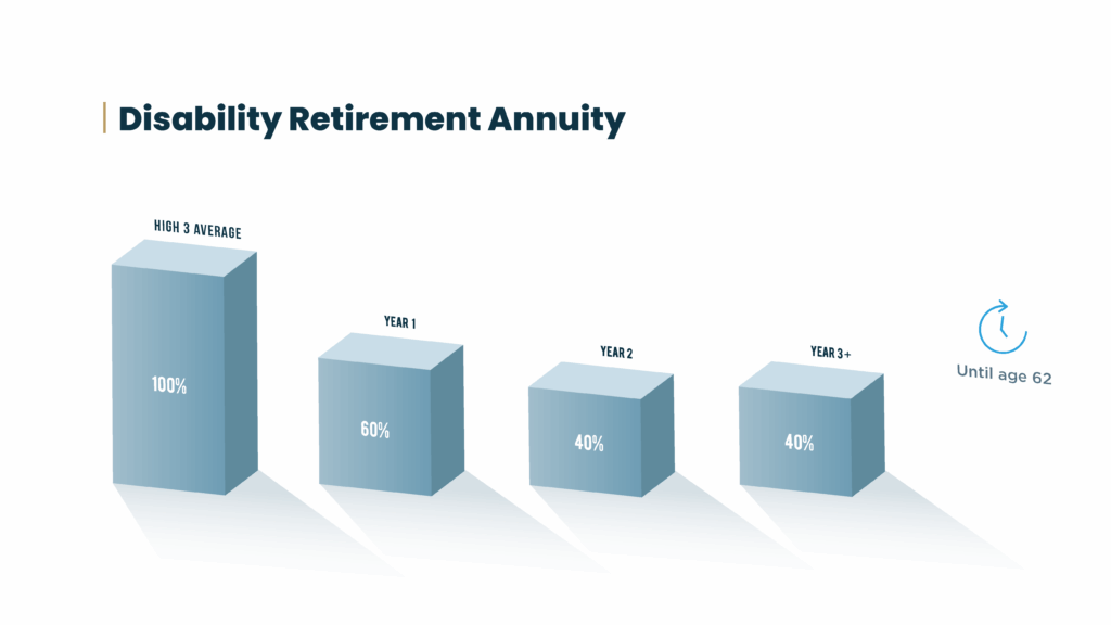 The first year you’re on it, you’re going to get 60% of your high-three average salary—so your highest 36 months of consecutive pay. You’re going to get that the first year. Then every year after that until age 62, you’re going to get 40% of your high-three average salary.