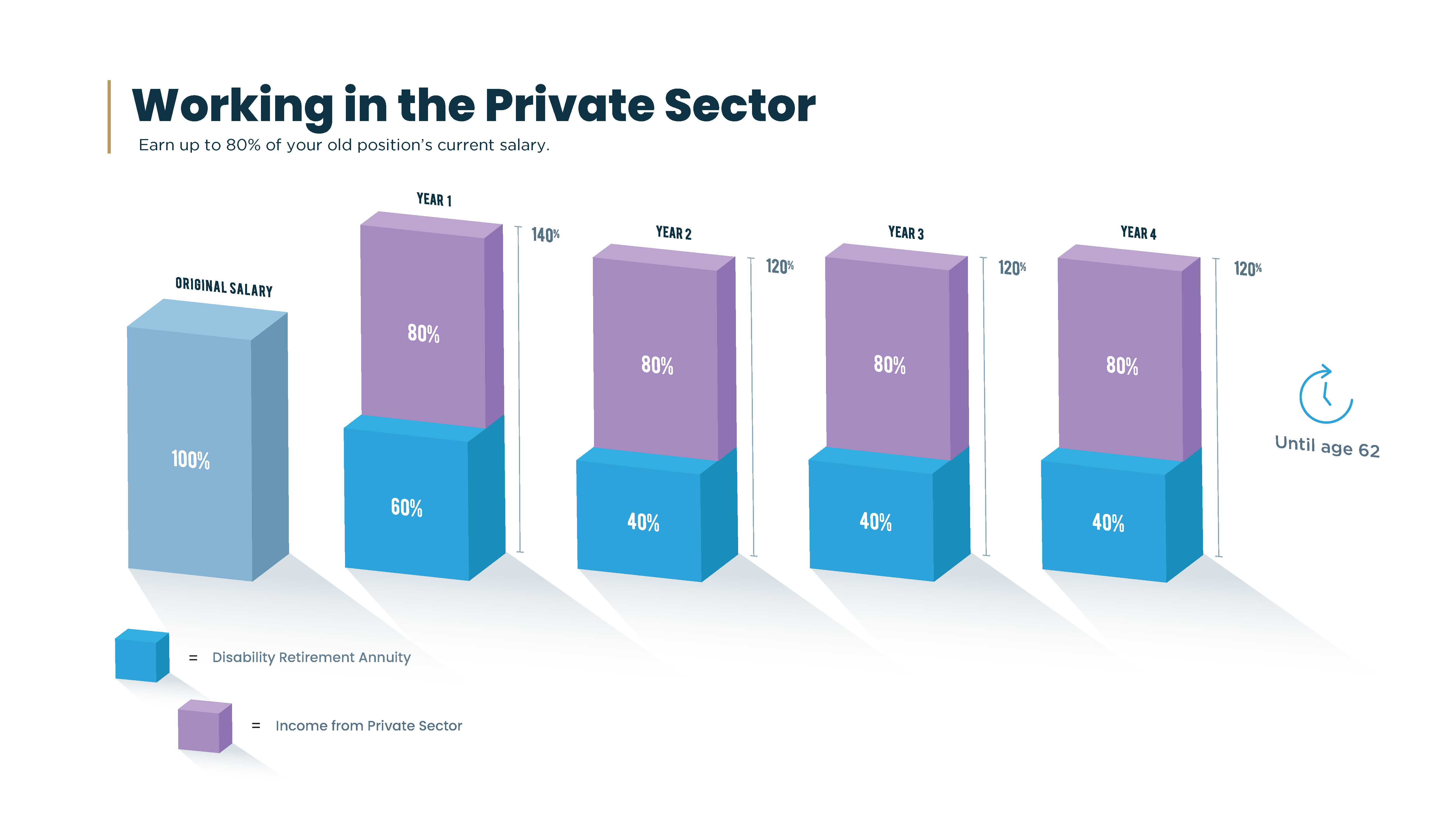 The first year, if you add those two blocks together, you’re going to be receiving upwards of 140% of both Disability Retirement and your income from a private sector combined.