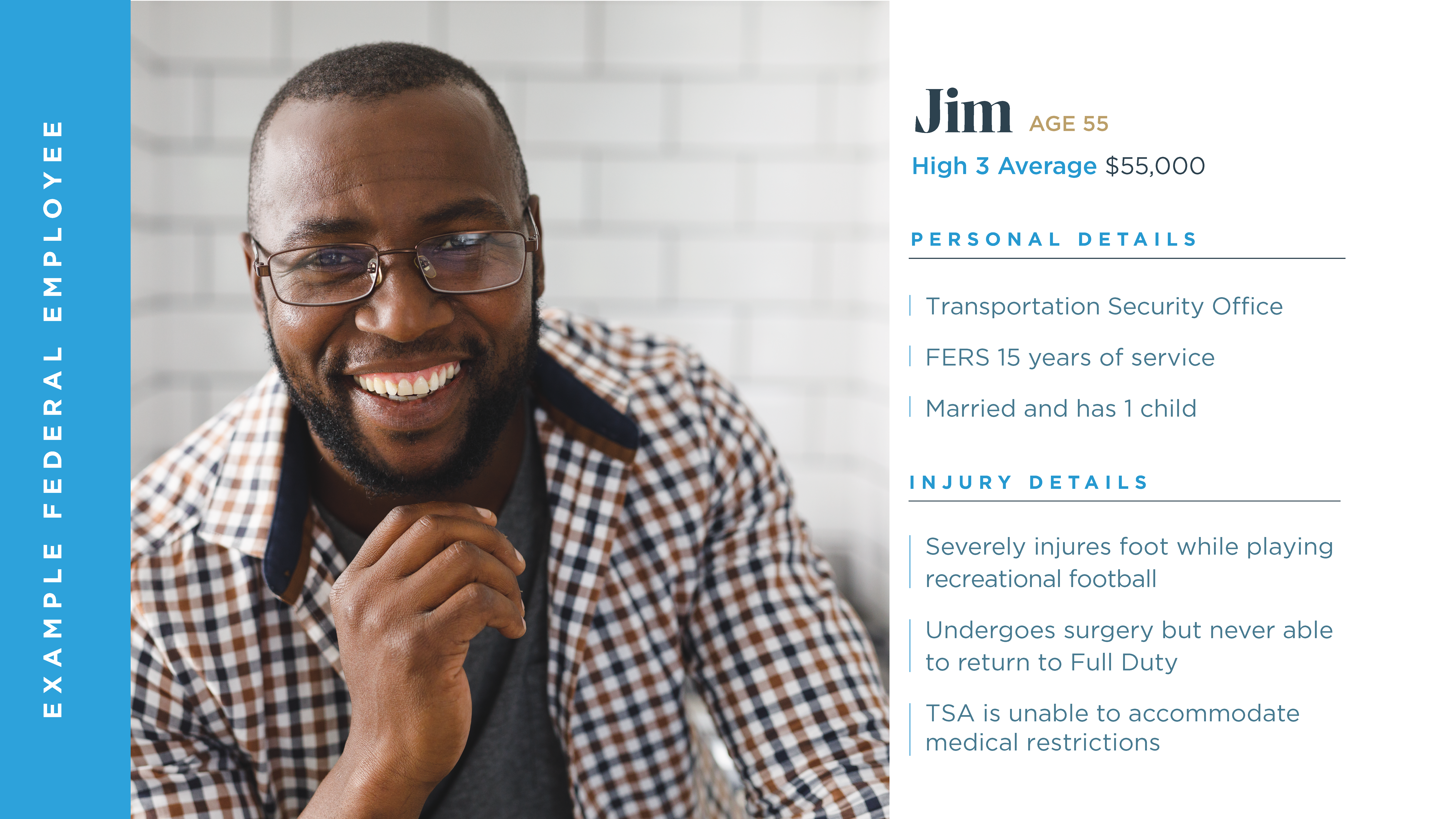 Jim is 55 years old, and his high-three average is also $55,000. He’s a transportation security officer, so he works for TSA. He’s been a covered FERS federal employee for 15 years. He’s married and has one child.