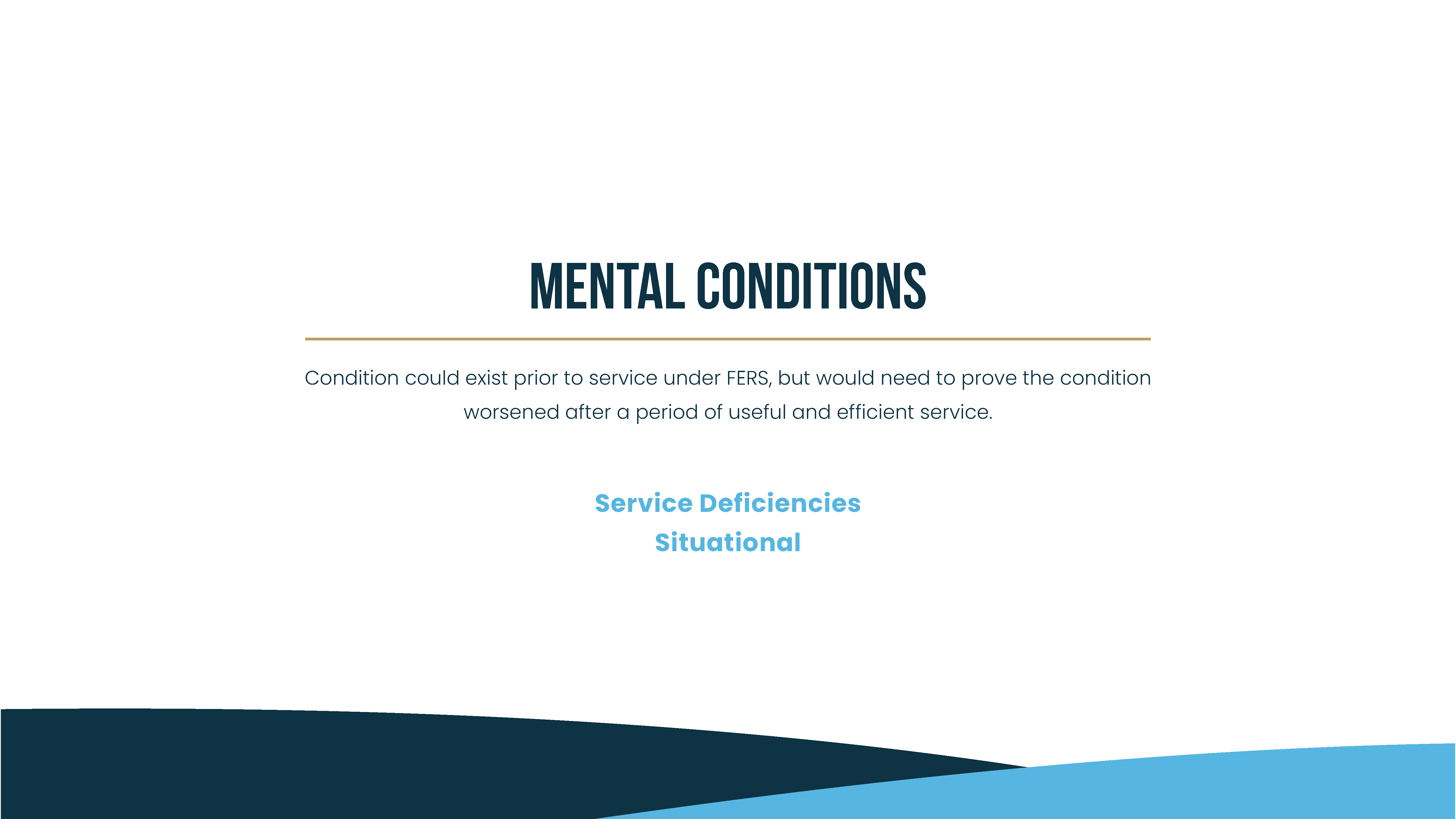 Ashley: And just a few examples, as you see here, for mental conditions that would qualify you for Disability Retirement would be major depressive disorder, bipolar disorder, post-traumatic stress disorder, and so on.