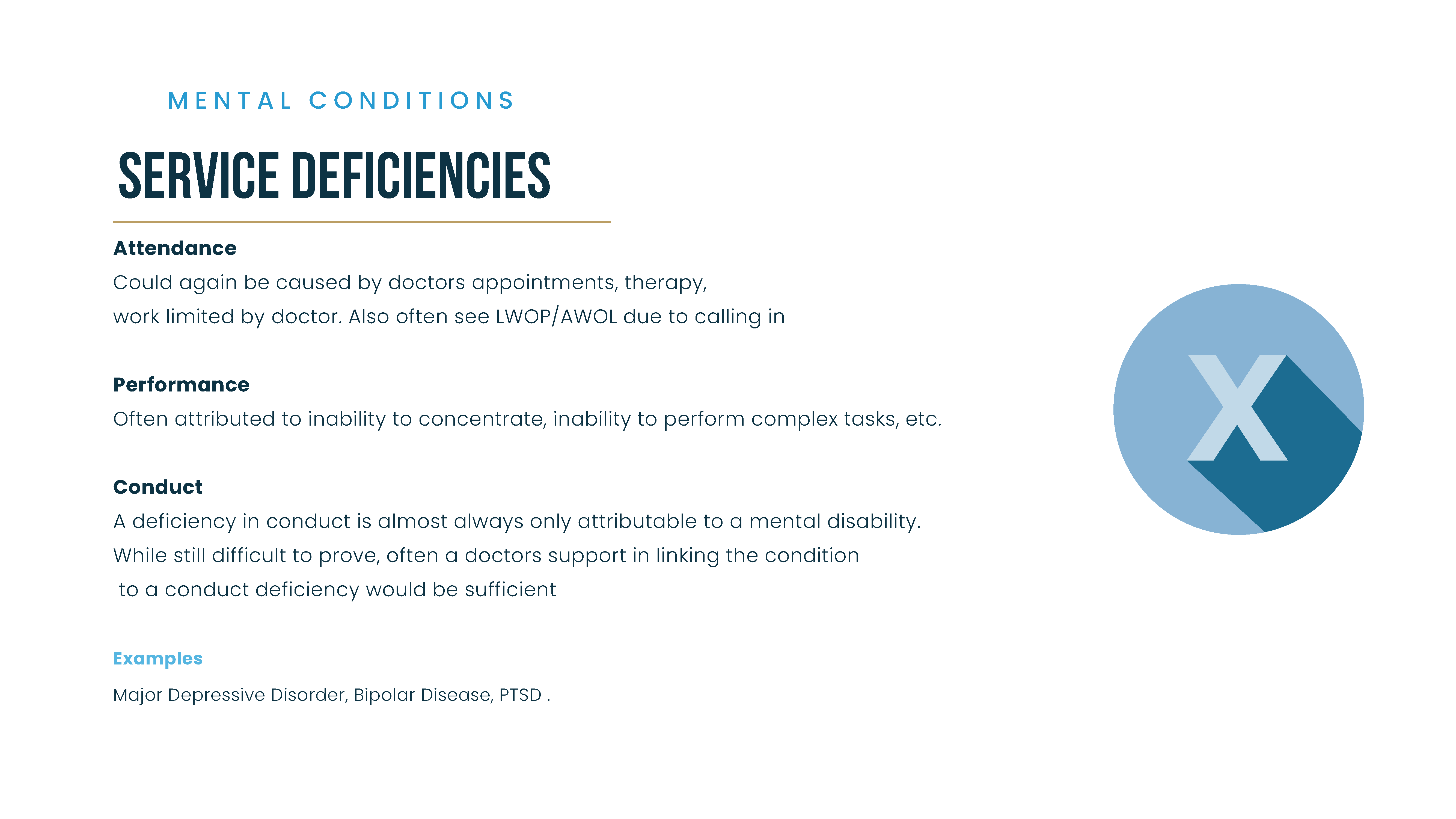 Anna: Yes. So with mental conditions, the service deficiency areas are the same—attendance, performance, and conduct—but they’re affected a little bit differently.