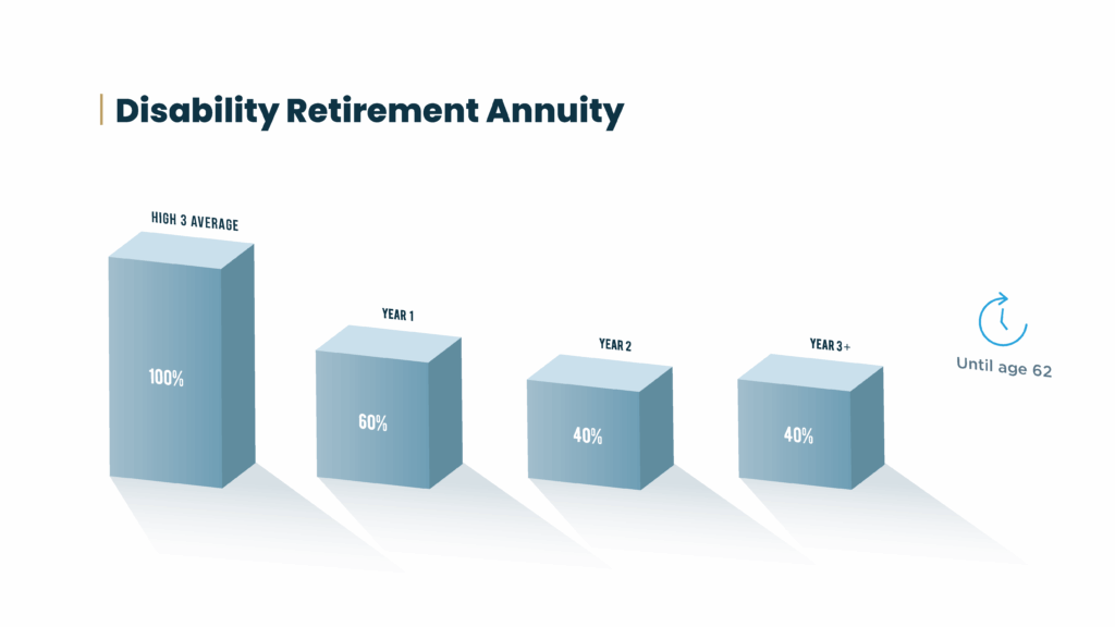 Rose: Once you’re approved for the Disability Retirement benefit you are going to receive 60% of your high three salary the first year and 40% of your high three average salary every year after that until you reach age 62. It’s important to remember that this is taxable income.