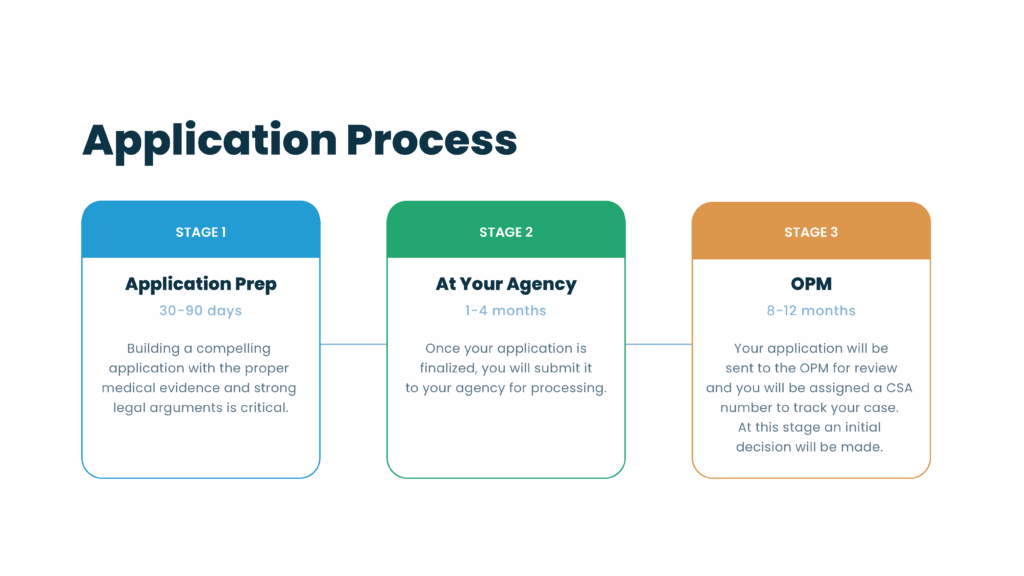A: Typically, 10-20 months total: 1-4 months for application prep, 1-4 months at your agency, and 8-12 months at OPM [Office of Personnel Management] for final decision. This is subject to change and depends on the situation.