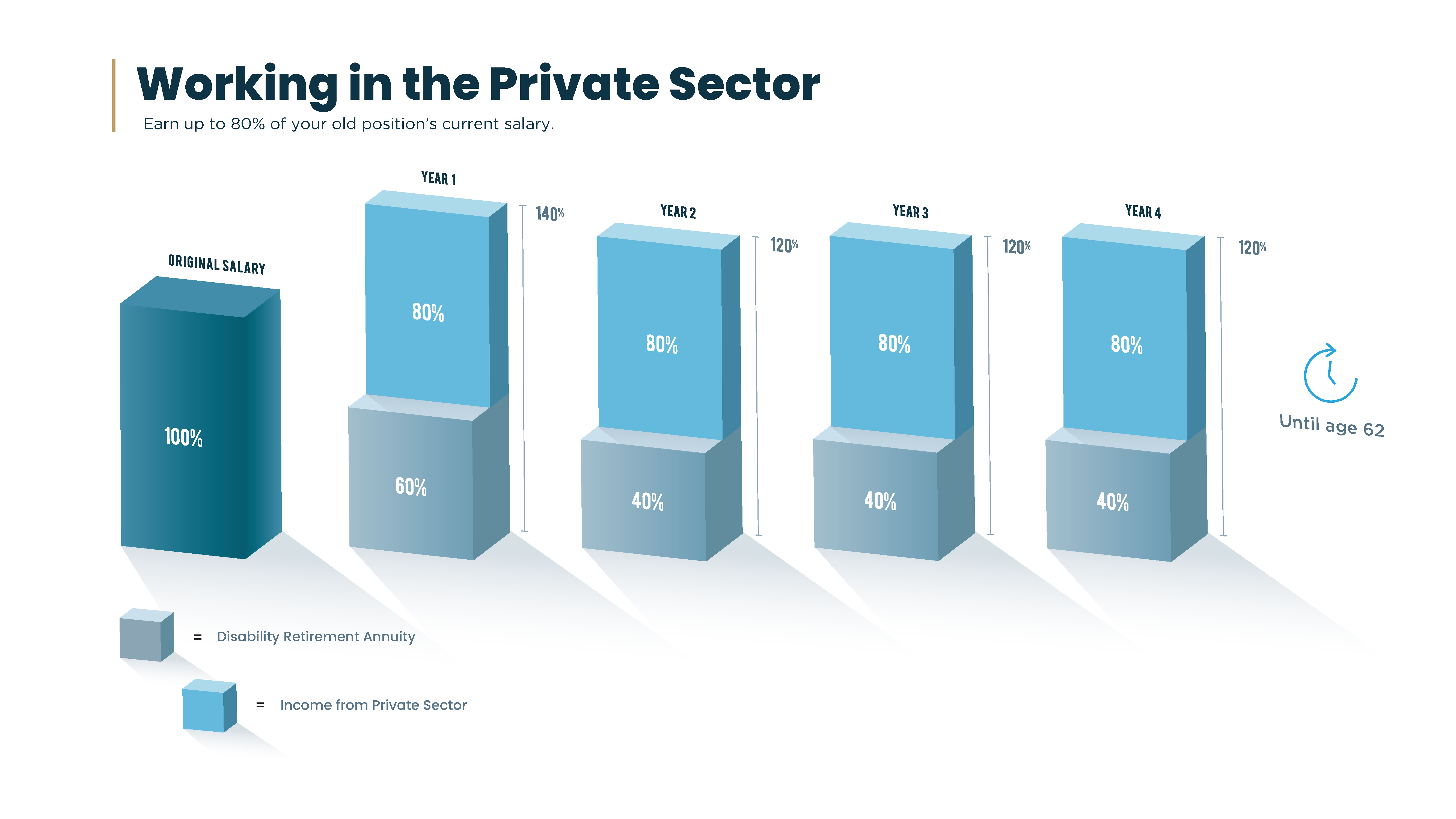 Kimberly: Similar to our last graph, you can see here your original salary at 100% and the lower darker bars are that 60% and 40%. But the top bar, that light blue, is the 80% that you could earn in the private sector. If you’re looking at year one, two, and every year after, you can potentially make even more than you did in the federal government while receiving the Disability Retirement and working in the private sector.