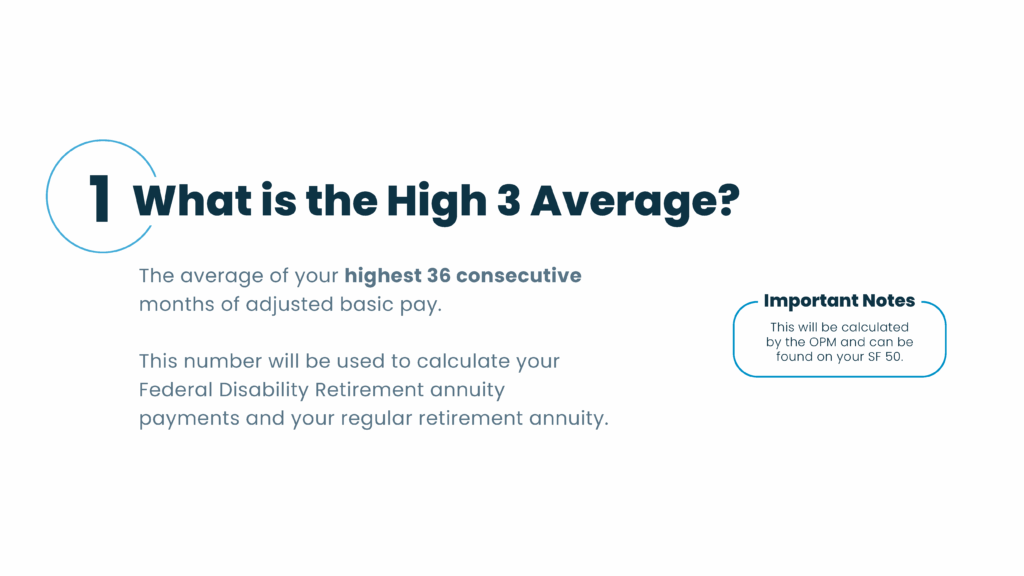 Hannah: We mentioned this earlier when talking about calculating your Federal Disability Retirement annuity, but your high-3 average is going to be the average of your highest 36 consecutive months of adjusted basic pay. This number will be calculated by the OPM, but it can also be found on your SF-50.
