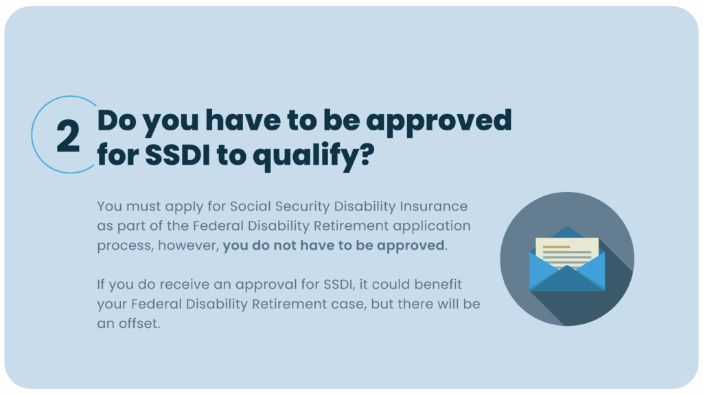 - You must apply for Social Security Disability: The OPM requires you to apply for SSDI, but approval isn’t necessary—it’s just a checkbox requirement.
