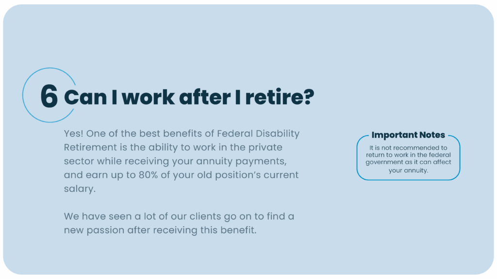 - You can work while receiving Federal Disability Retirement: Earn up to 80% of your current federal position’s salary in the private sector while collecting your annuity.