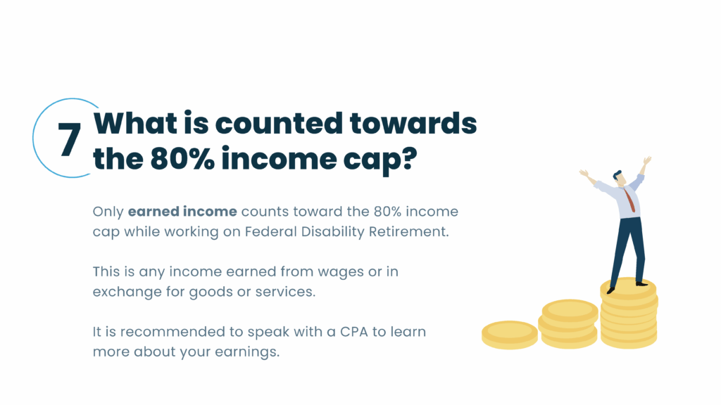 Hannah: What is counted toward this 80% income cap? Only earned income counts toward this 80% income cap while working on Federal Disability Retirement. This is any income earned from wages in exchange for goods and services.