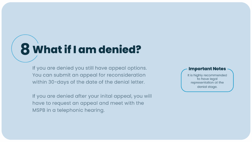If you are denied after your reconsideration, you will have to request an appeal and meet with the MSPB in a hearing with our attorney.