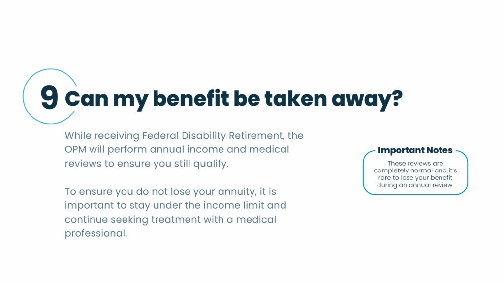 Kyleigh: It actually can be taken away. The OPM will perform annual income and medical reviews to make sure that you are still qualified for this benefit.