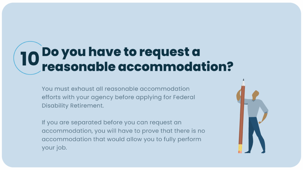 - Reasonable accommodation requests are mandatory: You must exhaust all reasonable accommodation efforts with your agency before applying for Disability Retirement.