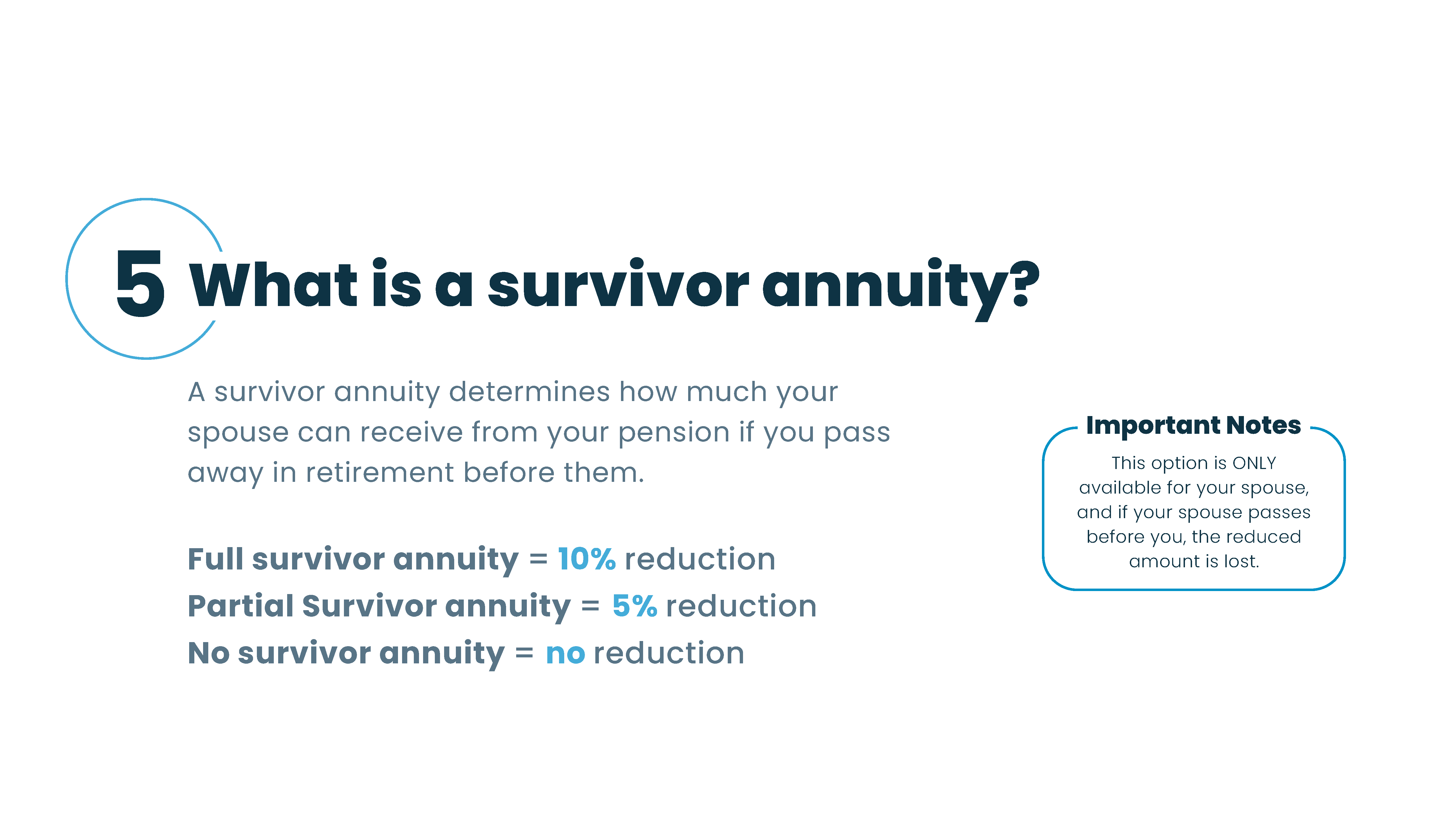 Hannah: A Survivor annuity determines how much your spouse can receive from your pension if you pass away in retirement before them.